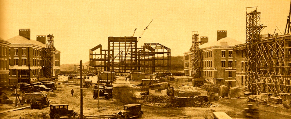 (View of Eastman Quadrangle & Rhees Library under construction.