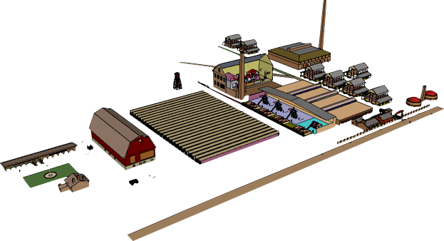 The above illustration was produced using the computer program titled “Sketch-Up”. Armed with the 1900 3-page text description and the six 1900 pictures of the Yard produced by the editors of the Bulletin for the New York State Museum then researching the large collection of digitized articles, newspapers and books on-line allowed the detail dimensions to be accessed for rendering of the Brick-Yard illustration.